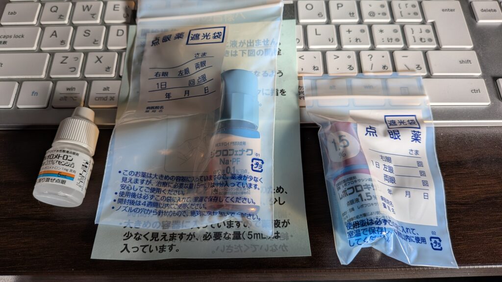 気球のやつで検査して、目薬3種を2回ずつ。感染予防(抗菌薬)と瞳孔広げるやつ。